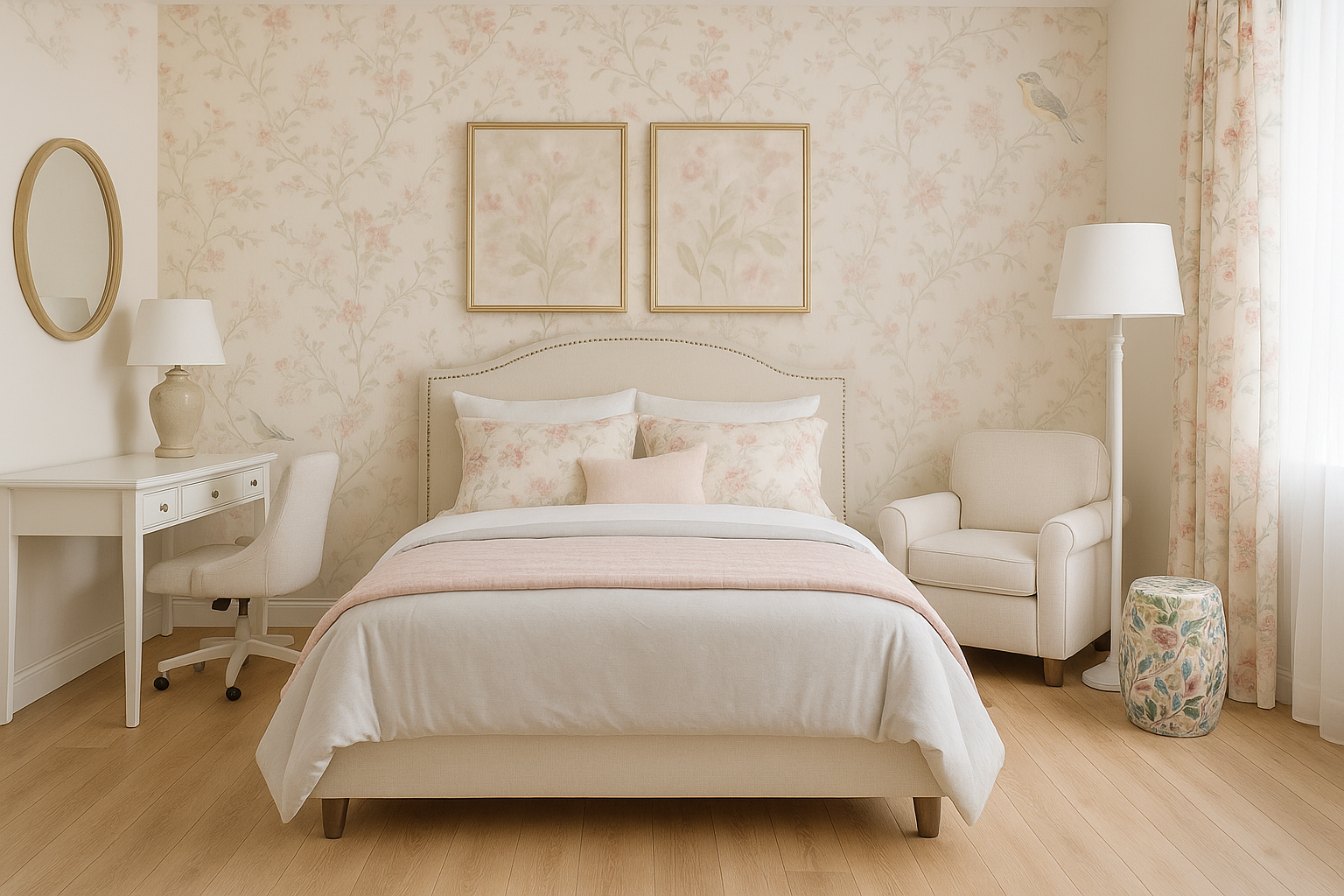 Primary Bedroom Design A serene composition of layered neutrals, soft florals, and understated luxury designed for calm and comfort.